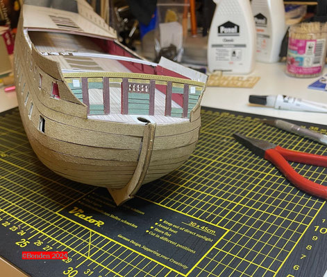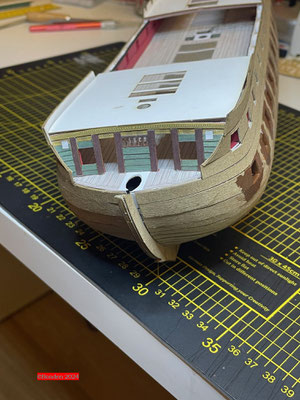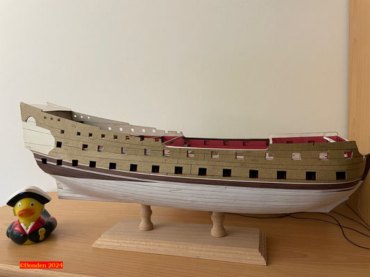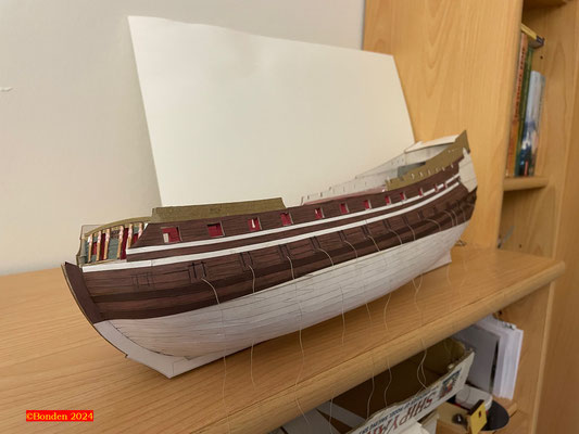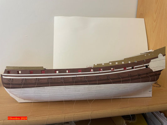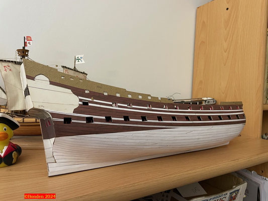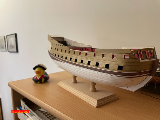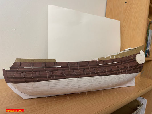 Erst hatte ich vor, den ganzen Kleinkram zu bauen und anzubringen, der an Deck muss, also Ankerspill, Nagelbänke, Pumpen etc. Aber dann habe ich mir überlegt, dass das nicht gut ist beim Anbringen der finalen Beplankung; unwillkürlich greift man dann doch rein ins volle Decksgewirr, und schon ist der Ärger da. Also erst einmal die Endbeplankung. Hier sind wieder alle Teile einzeln auszuschneiden, wobei das glücklicherweise zumeist gleich drei Planken auf einmal bedeutet. Dann fein säuberlich die Stückpfortenöffnungen ausschneiden. Vor dem Anbringen habe ich den Rumpf mit einem "2in1 Klarlack Lack + Grundierung seidenmatt" gestrichen/versiegelt. Das Zeug hatte ich von Außenarbeiten auf der Terrasse übrig. Wasserlöslich auf Acrylbasis, also nahezu geruchsarm und der Pinsel ließ sich problemlos auswaschen. Und ich hatte einen schönen glatten Untergrund, der nicht sofort den ganzen Leim weggeschlürft hat. So kann ich dann beim Ankleben der Plankenstreifen immer noch korrigieren, wenn etwas nicht richtig passt.