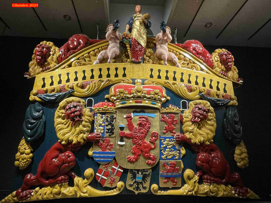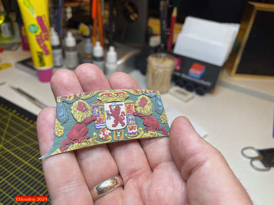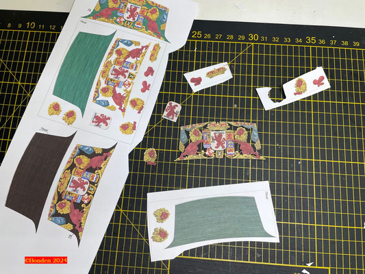 Und nun komme ich zu einem meiner Lieblingsteile, dem Heckspiegel. Hier bietet der Bausatz mehrere Varianten. Es gibt ihn als ein farbiges Teil, wahlweise mit dunkelbraunem oder grünen Hintergrund.. Oder man wählt die edlere, aber eben auch aufwändigere Variante und gestaltet diesen wunderschönen Heckspiegel dreidimensional. Ich wäre nicht ich, wenn ich nicht die zweite Variante wählen würde. Das Foto aus dem Bausatz zeigt, wie oft man was ausschneiden muss. Am Ende ergibt das dann ein wirklich schönes Teil - zum Vergleich füge ich ein Bild des Originalheckspiegels bei, wie er in Lelystad auf der Bataviawerft zu sehen ist.