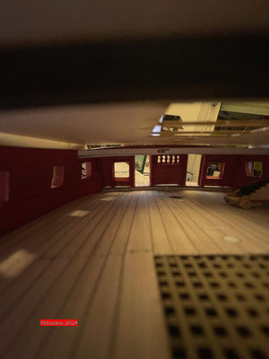 Damit keine Langeweile aufkommt, baue ich gern mal zwischendurch etwas anderes. Unterhalb des Vordecks kommt das erste Schott an Bord. Dafür gab es viele kleine Teile auszuschneiden, Kanten zu färben und kleine Fenster auszusticheln. Die Decksplatte ist in den Bildern nur locker draufgelegt.