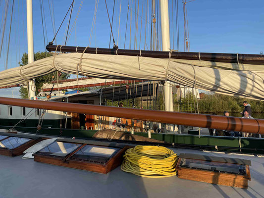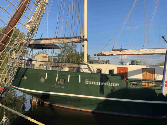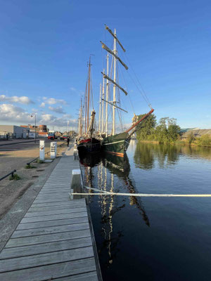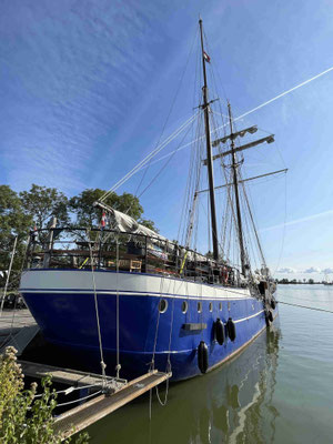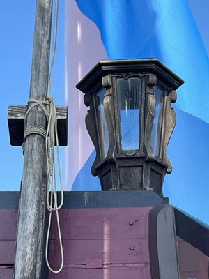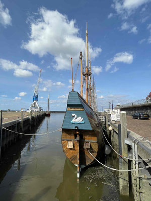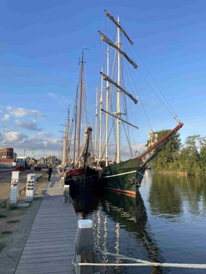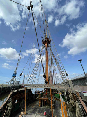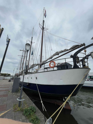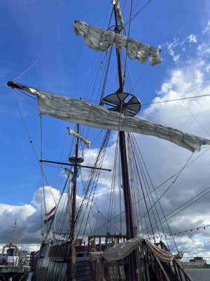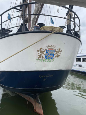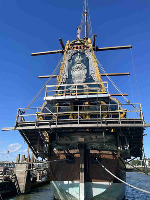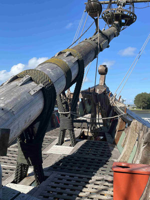 In Harlingen gab es dann etwas besonders Schönes zu sehen: Die Witte Swan, eine Replik des Entdeckerschiffes von Willem Barents' letzter Reise 1596. Schon einmal waren wir auf diesem Schiff, aber da war es noch im Bau - siehe hier meinen Reisebericht vom Frühjahrssegeln 2018. Und jetzt liegt das Schiff im Wasser, ist seetüchtig und schippert regelmäßig auf den Meeren umher.