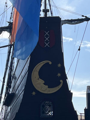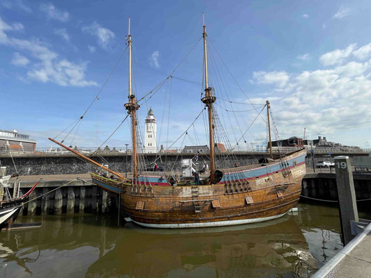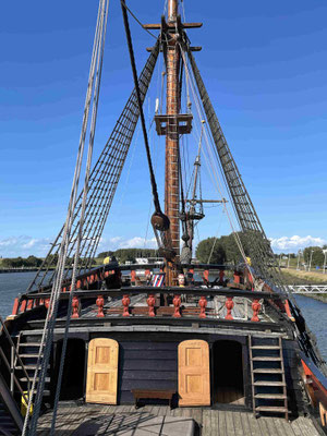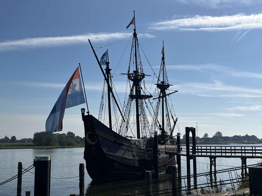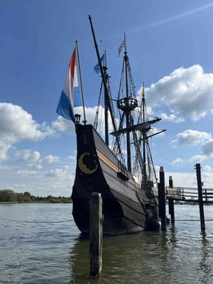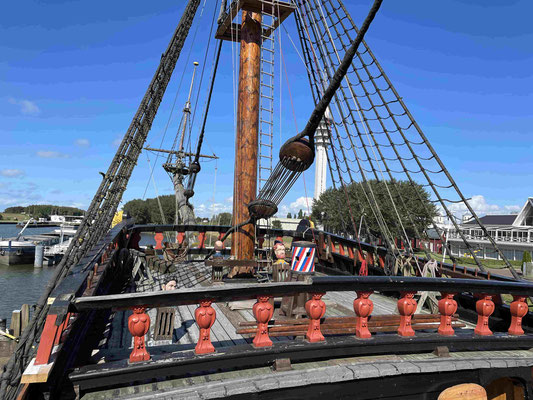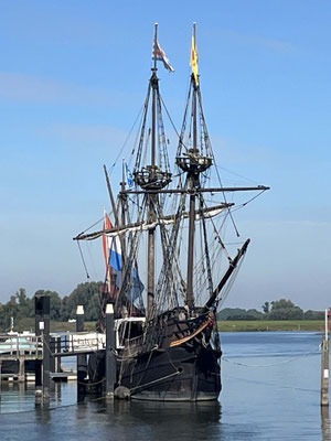 Am nächsten Tag fuhren wir nach Kampen. Kampen ist der Heimathafen unserer Hendrika Bartelds, die aber verständlicherweise um diese Zeit nicht zu Hause ist, sondern auf der Ostsee , dem Ijsselmeer oder dem Wattenmeer umher segelt. Aber ein anders schönes Segelschiff konnten wir dort besichtigen: Die Halve Maen, eine Replik eines VOC-Schiffes aus dem Jahre 1608. Kein Geringerer als der englische Kapitän Henry Hudson fuhr auf diesem Schiff und suchte eine nordwestliche Passage zum Pazifik. Zwar blieb dieses Unterfangen erfolglos, aber er war Namensgeber der Hudson-Bay und des Hudson-River.