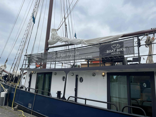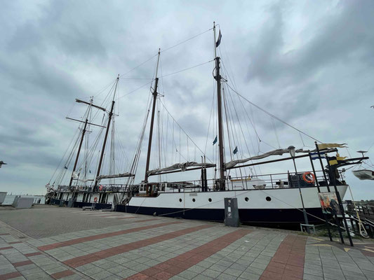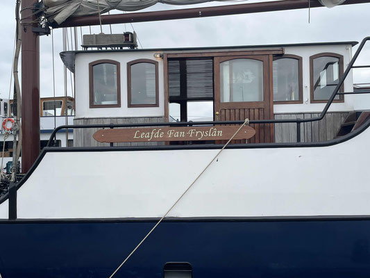 Im Hafen von Lemmer fanden wir dann noch ein etwas seltsam anmutendes Segelschiff, die Leafde fan Fryslan. 1937 als Dreimaster gebaut, fuhr sie zuerst unter dem Namen Thalata und war bis 1987 als Frachtsegler unterwegs. In den späten 90ern wurde das Schiff zu einer luxuriösen Dreimast-Schonerbark umgebaut, vor wenigen Jahren dann um 14 Meter verlängert und mit einem zusätzlichen Mast versehen. Irgendwie wirken die Proportionen nicht richtig, aber was soll's. Das Schiff bietet luxeriöses Segeln und bietet die Möglichkeit der Mitnahme von Fahrrädern, um bei Landaufenthalten mobil zu sein. Interessant!