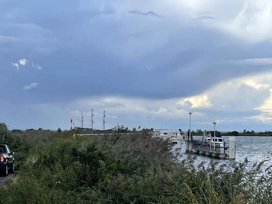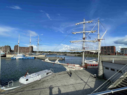Der Urlaub begann am IJsselmeer, konkret in Lelystad, wo einmal mehr ein Besuch der Bataviawerft auf dem Plan stand. Aber zuerst einmal sahen wir unmittelbar nach unserer Ankunft (das Urlaubsquartier war direkt am Wasser) in der Ferne drei Masten mit Rahen und Segeln. Man konnte nicht erkennen, um welches Schiff es sich handelt, aber sein Ziel war offenbar der ca. 4 km entfernte, Bataviahaven genannte Liegeort für so manche hübsche Segelschiffe. Also schnell wieder ins Auto gestiegen und gleich dort hin gefahren.